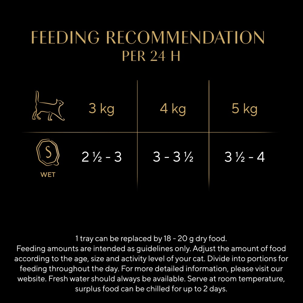 Analytical constituents (%): Protein: 9.5, Fat content: 5.0, Inorganic matter: 2.0, Crude fibre: 0.30, Moisture: 82.5, Additives per kg:, Nutritional additives:, Vitamin D₃: 200 IU (Vitamin D₃ not supplemented in salmon and tuna varieties), Taurine: 501 mg, Copper (Copper(II) sulphate pentahydrate): 1.1 mg, Iodine (Calcium iodate, anhydrous): 0.35 mg, Iron (Iron(II) sulphate monohydrate): 17.5 mg, Manganese (Manganous sulphate, monohydrate): 3.5 mg, Zinc (Zinc sulphate, monohydrate): 16.0 mg, Technological additives:, Cassia gum: 990 mgFEEDING GUIDELINES