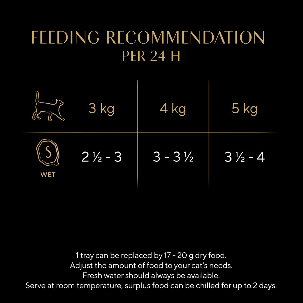 Analytical constituents (%): Protein: 7.9, Fat content: 5.0, Inorganic matter: 1.5, Crude fibre: 0.20, Moisture: 83.5, Additives per kg:, Nutritional additives:, Vitamin D₃: 200 IU (Vitamin D₃ not supplemented in fish variety), Taurine: 620 mg, Copper (Copper(II) sulphate pentahydrate): 1.3 mg, Iodine (Calcium iodate, anhydrous): 0.34 mg, Iron (Iron(II) sulphate monohydrate): 16.8 mg, Manganese (Manganous sulphate, monohydrate): 3.4 mg, Zinc (Zinc sulphate, monohydrate): 16.2 mgFEEDING GUIDELINES