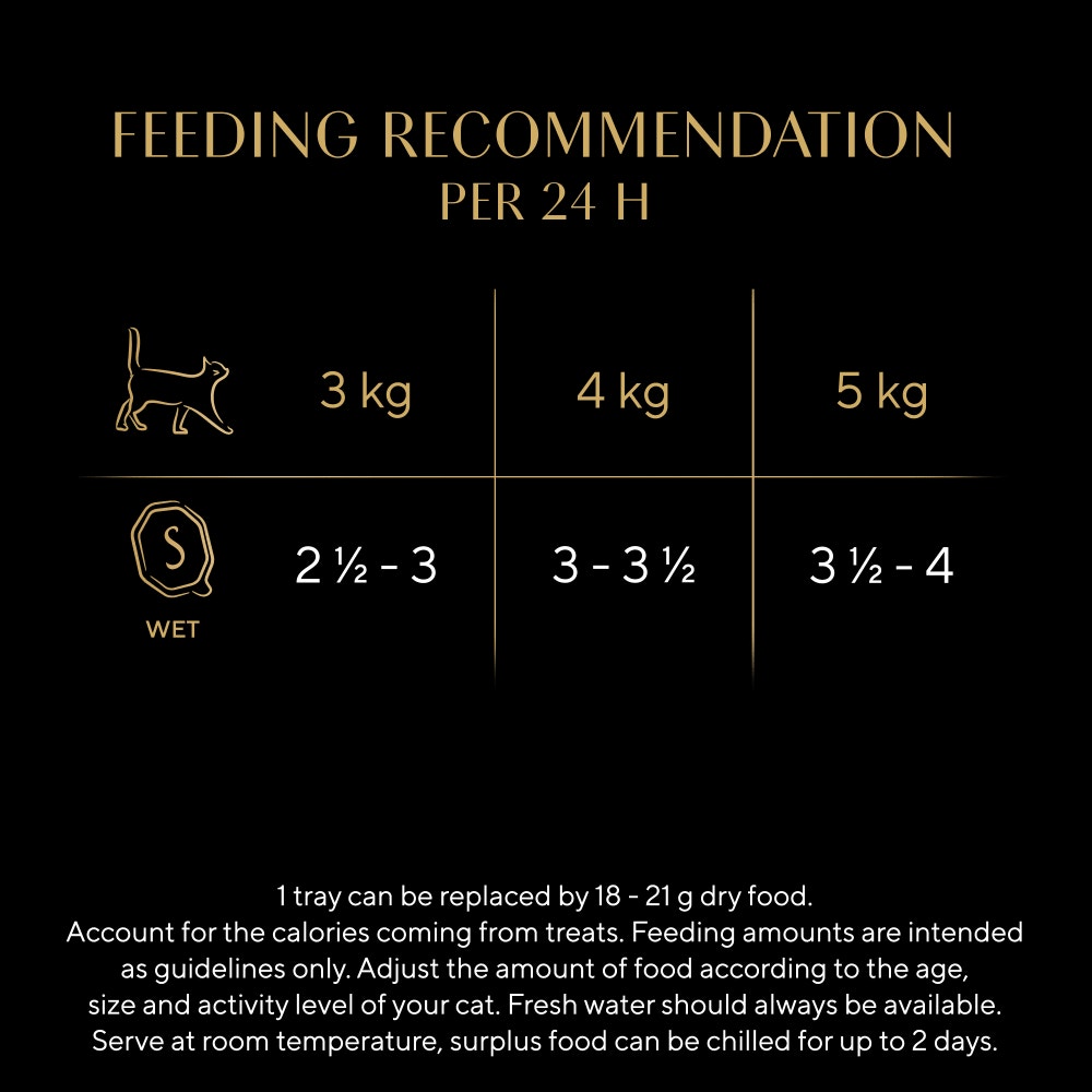With Chicken and Turkey Analytical constituents (%): Protein: 8.7, Fat content: 5.0, Inorganic matter: 2.0, Crude fibre: 0.31, Moisture: 82.0, Additives per kg:, Flavourings; Nutritional additives:, Vitamin D₃: 200 IU, Taurine: 620 mg, Copper (Copper(II) sulphate pentahydrate): 1.3 mg, Iodine (Calcium iodate anhydrous): 0.34 mg, Iron (Iron(II) sulphate monohydrate): 16.8 mg, Manganese (Manganous sulphate, monohydrate): 3.4 mg, Zinc (Zinc sulphate, monohydrate): 16.2 mg With Chicken Analytical constituents (%): Protein: 8.7, Fat content: 5.0, Inorganic matter: 2.0, Crude fibre: 0.31, Moisture: 82.0, Additives per kg:, Flavourings; Nutritional additives:, Vitamin D₃: 200 IU, Taurine: 620 mg, Copper (Copper(II) sulphate pentahydrate): 1.3 mg, Iodine (Calcium iodate anhydrous): 0.34 mg, Iron (Iron(II) sulphate monohydrate): 16.8 mg, Manganese (Manganous sulphate, monohydrate): 3.4 mg, Zinc (Zinc sulphate, monohydrate): 16.2 mg With Poultry Analytical constituents (%): Protein: 8.7, Fat content: 5.0, Inorganic matter: 2.0, Crude fibre: 0.31, Moisture: 82.0, Additives per kg:, Flavourings; Nutritional additives:, Vitamin D₃: 200 IU, Taurine: 620 mg, Copper (Copper(II) sulphate pentahydrate): 1.3 mg, Iodine (Calcium iodate anhydrous): 0.34 mg, Iron (Iron(II) sulphate monohydrate): 16.8 mg, Manganese (Manganous sulphate, monohydrate): 3.4 mg, Zinc (Zinc sulphate, monohydrate): 16.2 mg With Turkey Analytical constituents (%): Protein: 8.7, Fat content: 5.0, Inorganic matter: 2.0, Crude fibre: 0.31, Moisture: 82.0, Additives per kg:, Flavourings; Nutritional additives:, Vitamin D₃: 200 IU, Taurine: 620 mg, Copper (Copper(II) sulphate pentahydrate): 1.3 mg, Iodine (Calcium iodate anhydrous): 0.34 mg, Iron (Iron(II) sulphate monohydrate): 16.8 mg, Manganese (Manganous sulphate, monohydrate): 3.4 mg, Zinc (Zinc sulphate, monohydrate): 16.2 mgFEEDING GUIDELINES